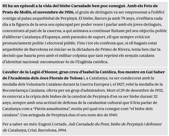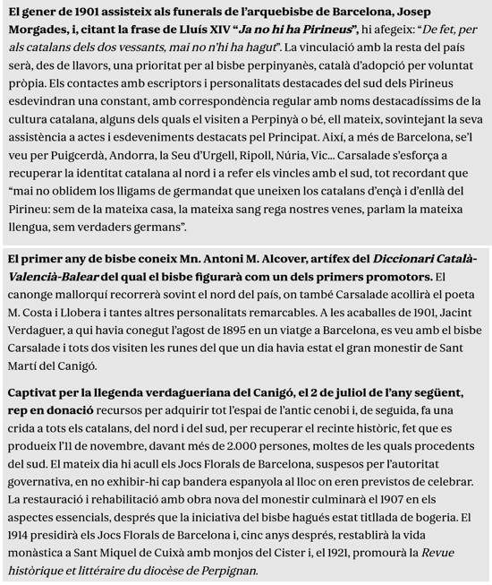 En moments concrets de la història hi ha personatges que tenen transcendència, més enllà de la seva personalitat, però que no han tingut la repercussió i permanència de la seva figura. Aquest és el cas d’en Juli Carsalade, bisbe durant 32 anys de Perpinyà, un apassionat de la cultura catalana, que gaudirà del suport i amistat de les dues Catalunyes que com ell diu “Ja no hi ha Pirineus”…
