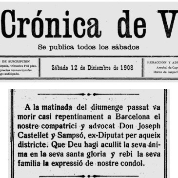 CRONOLOGIA DOCUMENTADACorrespon als darrers anys de la seva vida.1903 a 1905 : Apareix al “Anuario de Ferrocarriles”, com a Director Gerent de la “Compañia Anónima de Tranvias y Ferrocarriles Economicos” (Imatges 1, 2 i 3).1905 : Ressenya en que es mencionen els diferents diputats que ha tingut el districte de Valls, i la seva dedicació … More Josep Castellet Sampso (de 1903 a 1908) (M120)