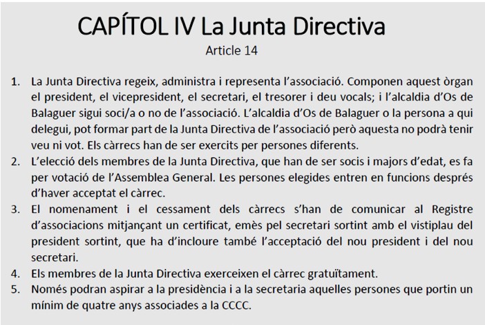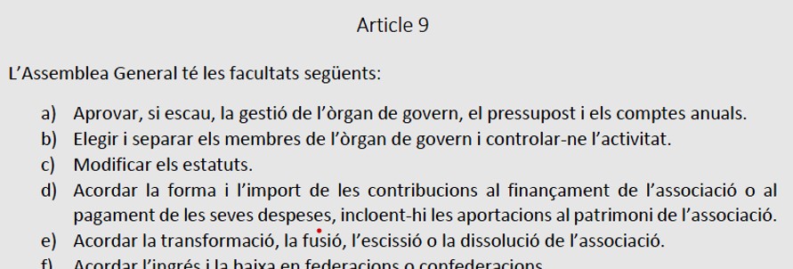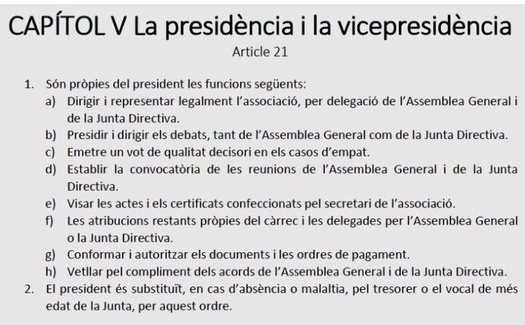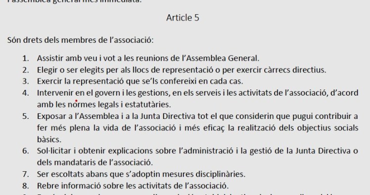 Els aspectes relacionats amb els estatuts, o la seva modificació, la lectura de l’acta de l’Assemblea anterior o els comptes anuals són aspectes obligatoris i tècnics. Tots els socis estem obligats a preguntar i fer que, el nostre vot, sigui el més ajustat al que s’està debatent i/o aprovant; que uns estatuts aprovats fa quatre anys, i amb aspectes contradictoris no hagin estat qüestionats o comentats (tant en el moment de la seva aprovació o posteriorment) fa pensar en una percepció molt baixa del que representen i, de quina forma, la seva aprovació ens incideix ara en el futur.