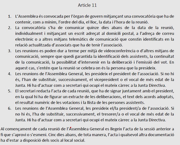 c) L’article 11 recorda la manera en què s’han de convocar les Assemblees i qui les dirigeix en cas d’absència del President. En aquest article hi ha una discrepància respecte dels punts 4 i 6 però com, que el numero 4, ha estat incorporat primerament i també esfa esment al Vicepresident, el punt 6 pot entendre’s com una duplicitat que el contradiu, encara que, en el punt 6, es parla de President/a, tresorer/a.