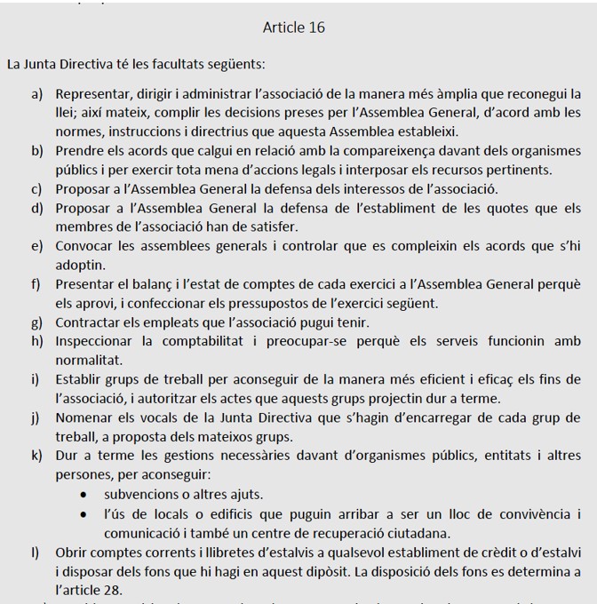 d) L’article 16, quan fa referència a les funcions de la Junta Directiva diu en el seu primer punt, que “…administrar…de la manera més àmplia que reconegui la llei…complir les decisions preses per l’Assemblea General, d’acord amb les normes, instruccions i directrius que aquesta Assemblea estableixi…”; s’entén que, la Junta Directiva, ha d’actuar d’acord amb el que s’hagi acordat a l’Assemblea i, per tant, seguir les directrius dels Estatuts, d’una forma no restrictiva.