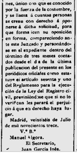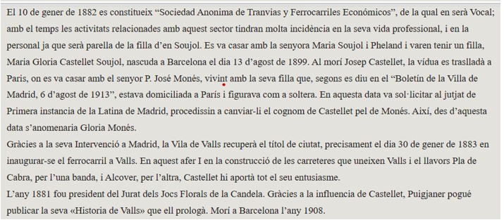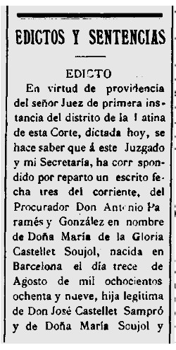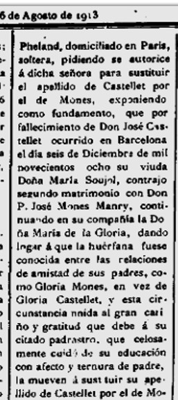 L’any 1913, en un edicte que reproduïm, en Pedro José Monés Maury demana, al Jutjat del districte de La Latina a Madrid, de modificar el nom de la Gloria Castellet, per Gloria Monés, alegant que sempre l’identifiquen amb aquest darrer cognom. Transcrivim el text de l’edicte publicat a “Diario Oficial de Avisos de Madrid”, en la seva edició del 6 d’agost de 1913 :