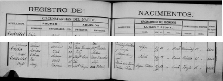 Consultable al fitxer 002C5FC8.PDF corresponents als naixements de l’any 1889, lletra C, a l’arxiu de Barcelona, consultes en linia “ajuntament.barcelona.cat/arxiumunicipal/ca”