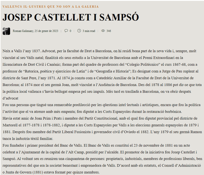 Poques biografies poden tenir l’empenta, la varietat d’àmbits en que va intervenir, i l’efecte en tot allò que va gestionar, amb una mirada sobre la seva Valls natal. Advocat de professió, va compaginar la seva vida politica, amb un nombre important d’iniciatives (Banc de Valls, Tranvies de Barcelona, Aigües de Tarragona…); un personatge oblidat que mereixeria, més enllà d’un carrer a Valls, un reconeixement singular a totes les persones que van fer possible la Catalunya pròspera del segle XIX, i, serveixin aquestes entrades, com un gest en aquest sentit.
