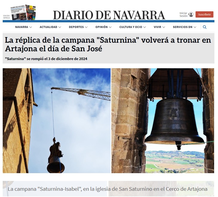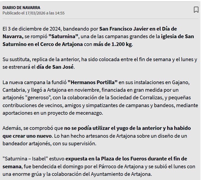 Per la diada de “San Francisco Javier” de l’any 2024, la campana “Saturnina” es va trencar “bandeando” (balançant-se), una de les campanes grans, de mes de 1200 quilos; aquest darrer cap de semana ha estat col.locada novament la replica de la mateixa, fosa als tallers de “Hermanos Portilla”, i s’ha fet un jou nou, ja que no s’ha pogut utilizar l’anterior, per artesants de la propia Artajona.