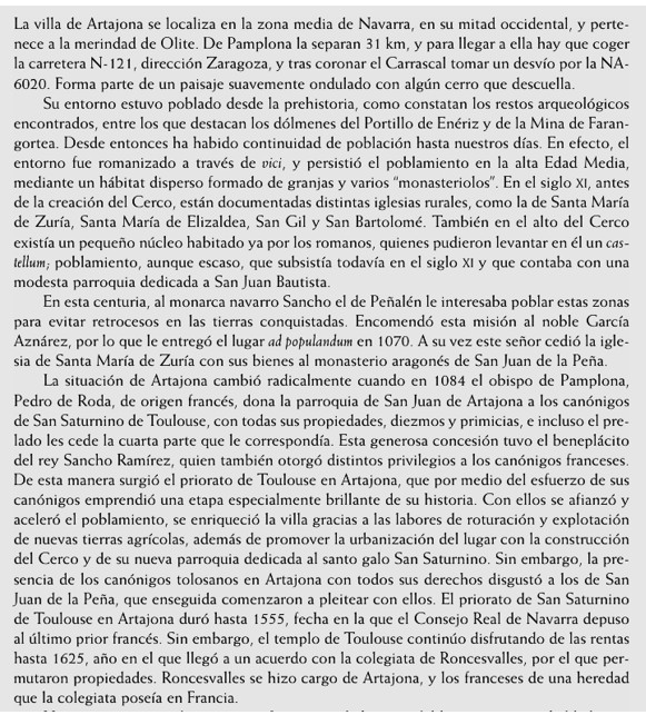 L’esglesia de San Saturnino, té una llarga historia i una vinculació amb la ciutat occitana de Tolosa de Llanguedoc; en aquesta ressenya a “www.romanicodigital.com/sites/default/files/pdfs/files/navarra_Artajona.pdf”, dona detall d’aquest fet :