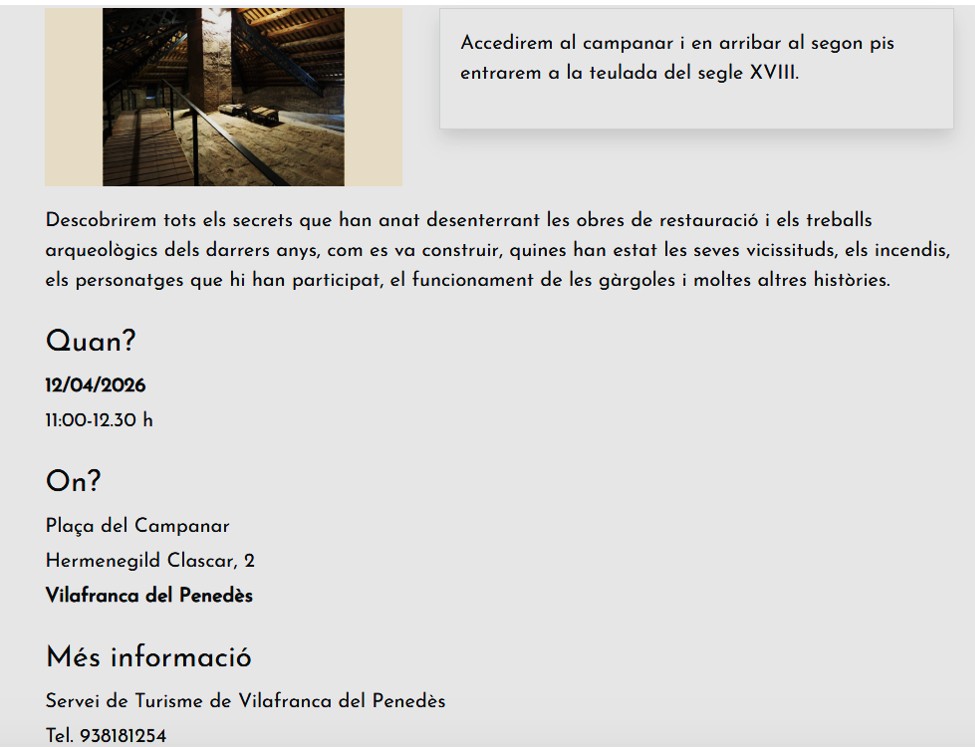 El Servei de Turisme de Vilafranca del Penedès va organitzar, ahir diumenge dia 12, la visita a un d’aquests racons plens d’història, i amagats de la curiositat pública, per endinsar-nos en l’interior del campanar, submergir-nos en el silenci de l’espai i gaudir de la visita comentada que se’ns oferia. Segur que no hi hagut grans descobertes, ni troballes,, ni pintures, ni objectes religiosos rellevants… el campanar és un espai pràctic amb les seves funcions i funcionalitats; però com aquell que inicia un camí al desconegut, cal tenir els ulls curiosos i oberts per gaudir de cada racó o explicació.