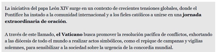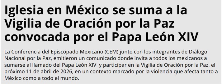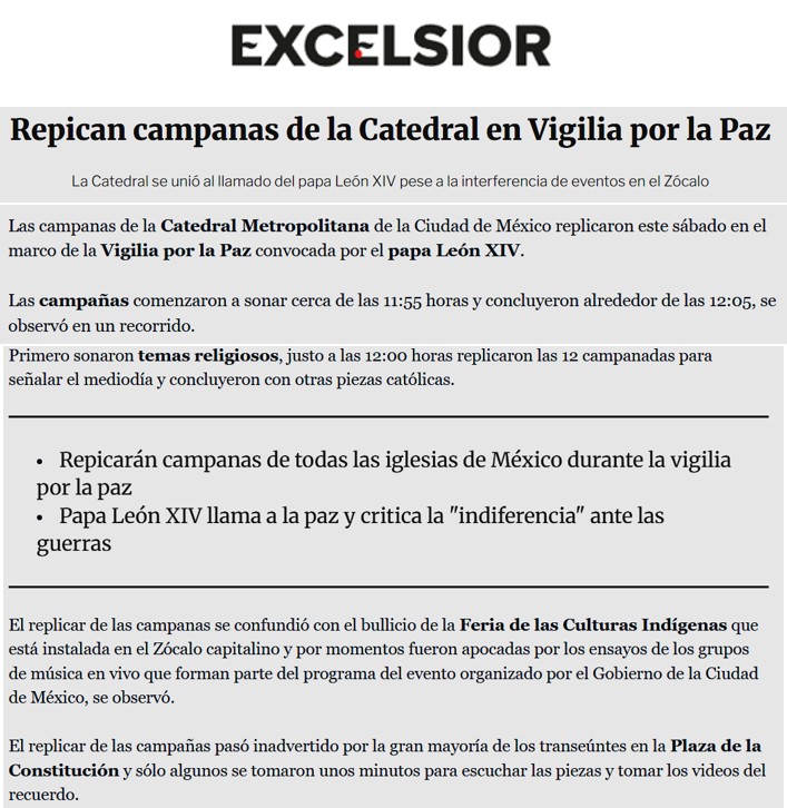 El dissabte dia 11 d’abril la Catedral de la Ciutat de Mèxic, va fer seu el missatge de pau del Papa Lleó XIV, amb el repic de campanes, tal com refereix el mitjà de comunicació “Excelsior” d’aquell pais, amb motiu de la “Vetlla de Pregària per la Pau”